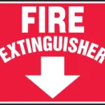 Red and white sign with bold arrow draws attention to the location of a fire extinguisher.