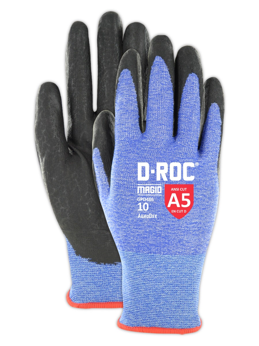 Ideal for delicate work that requires enhanced dexterity, these Magid® D-ROC® GPD486 Cut-Resistant Work Gloves are made of 18-gauge AeroDex® engineered yarn for great tactile sensitivity. The AeroDex shell delivers excellent level A5 cut resistance, while still being cooler and 50% lighter than a traditional HPPE safety glove of the same cut level. Touchscreen compatibility means workers don’t have to remove their gloves to use smartphones and tablets, increasing compliance and making it easier to stay in touch on the job. These nitrile coated work gloves are specially designed to channel oil away for a superb grip in light oil applications, and they feature a shield graphic that is color-coded by cut level, making it easy to identify cut level for compliance purposes. The color-coded overcast on these puncture-resistant gloves acts as a visual aid for sizing and helps prevent fraying.