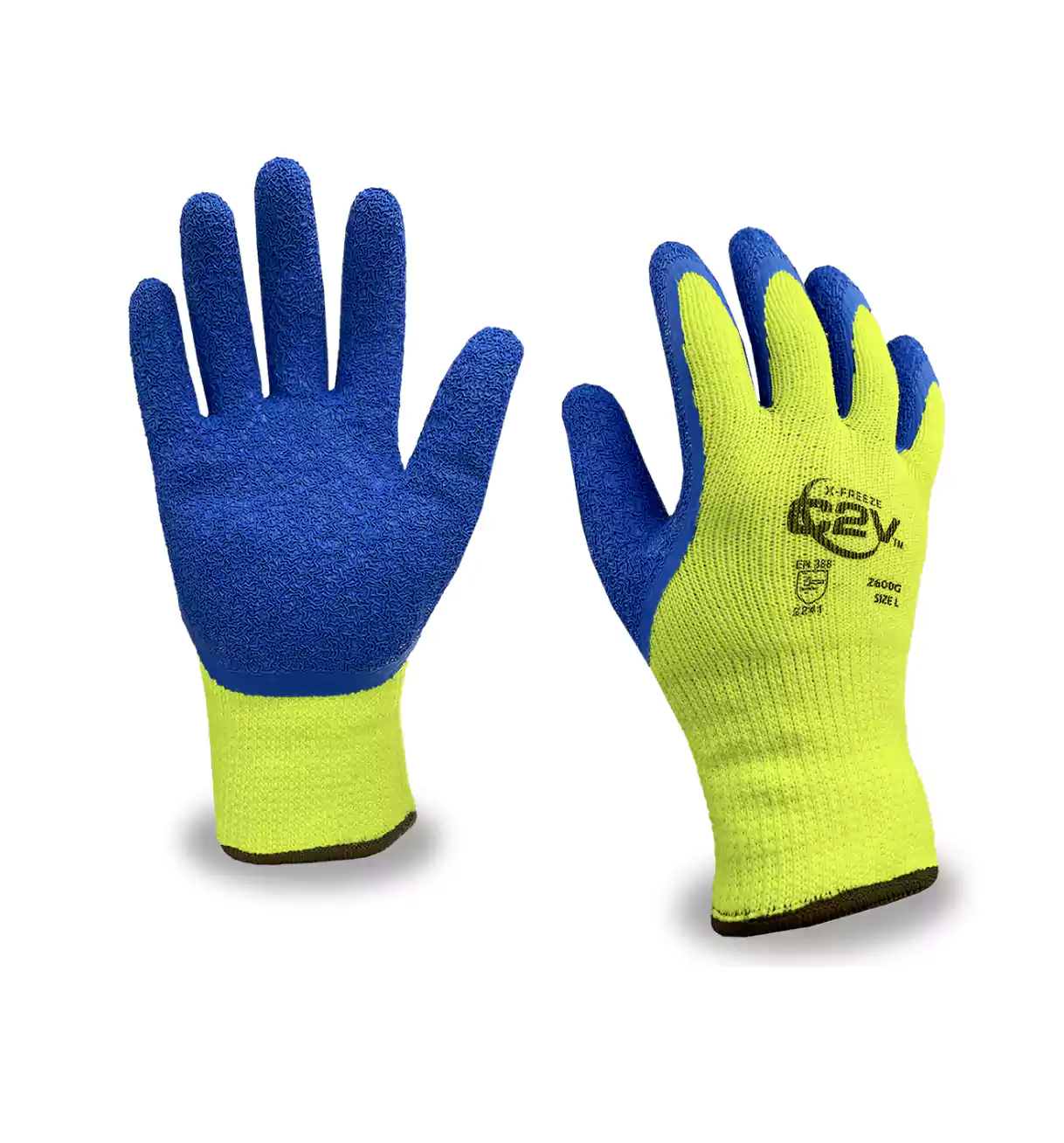 The X-Freeze 2600G is a versatile solution for exceptional hand protection. They offer outstanding gripping power and reliable defense against punctures and abrasion. The seamless, machine-knit shells provide a comfortable fit, while the high elasticity of the latex coating ensures flexibility and dexterity. With a thermal, 10-gauge, hi-vis yellow terry shell and a brushed polyester interior, these gloves offer cold weather protection. The blue crinkle latex palm coating provides excellent grip in wet and dry conditions.